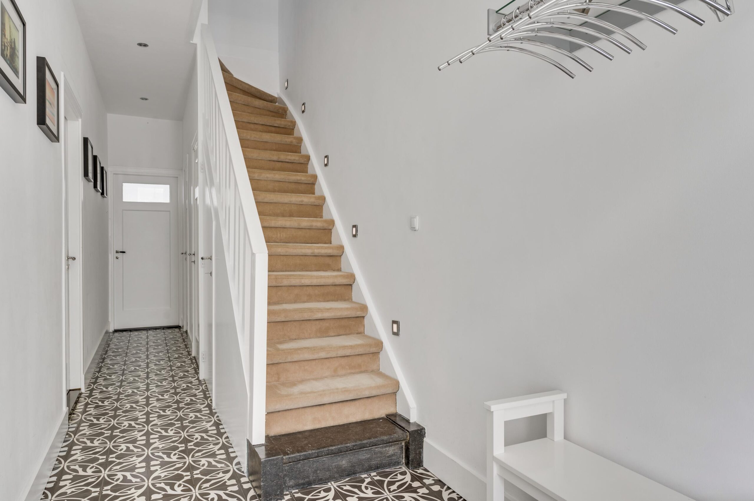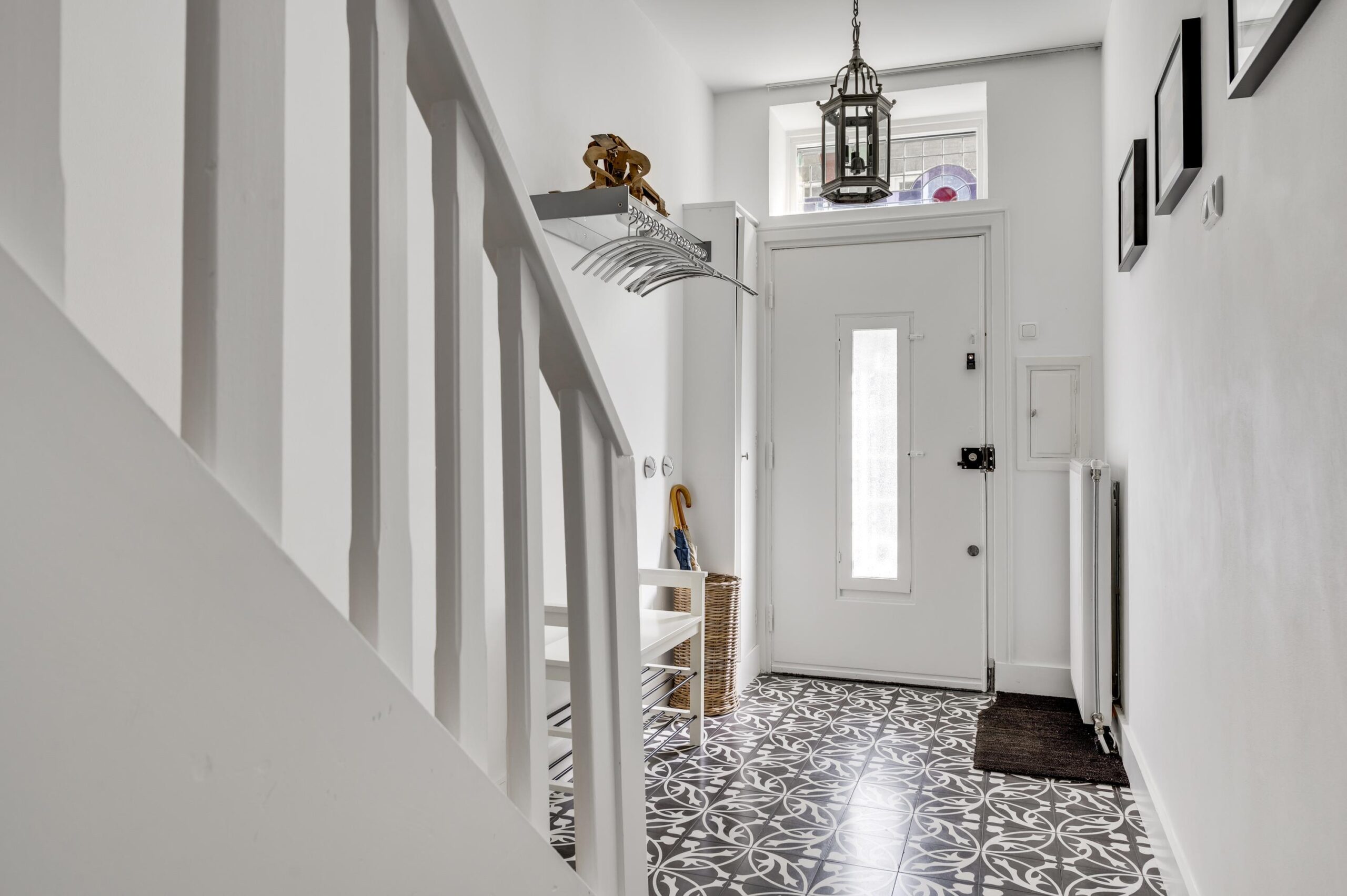 De stijlvolle entree met originele glas-in-loodramen en tegelvloer biedt toegang tot de meterkast, garderobekast en het souterrain. De moderne toiletruimte is voorzien van een wandcloset en fontein.