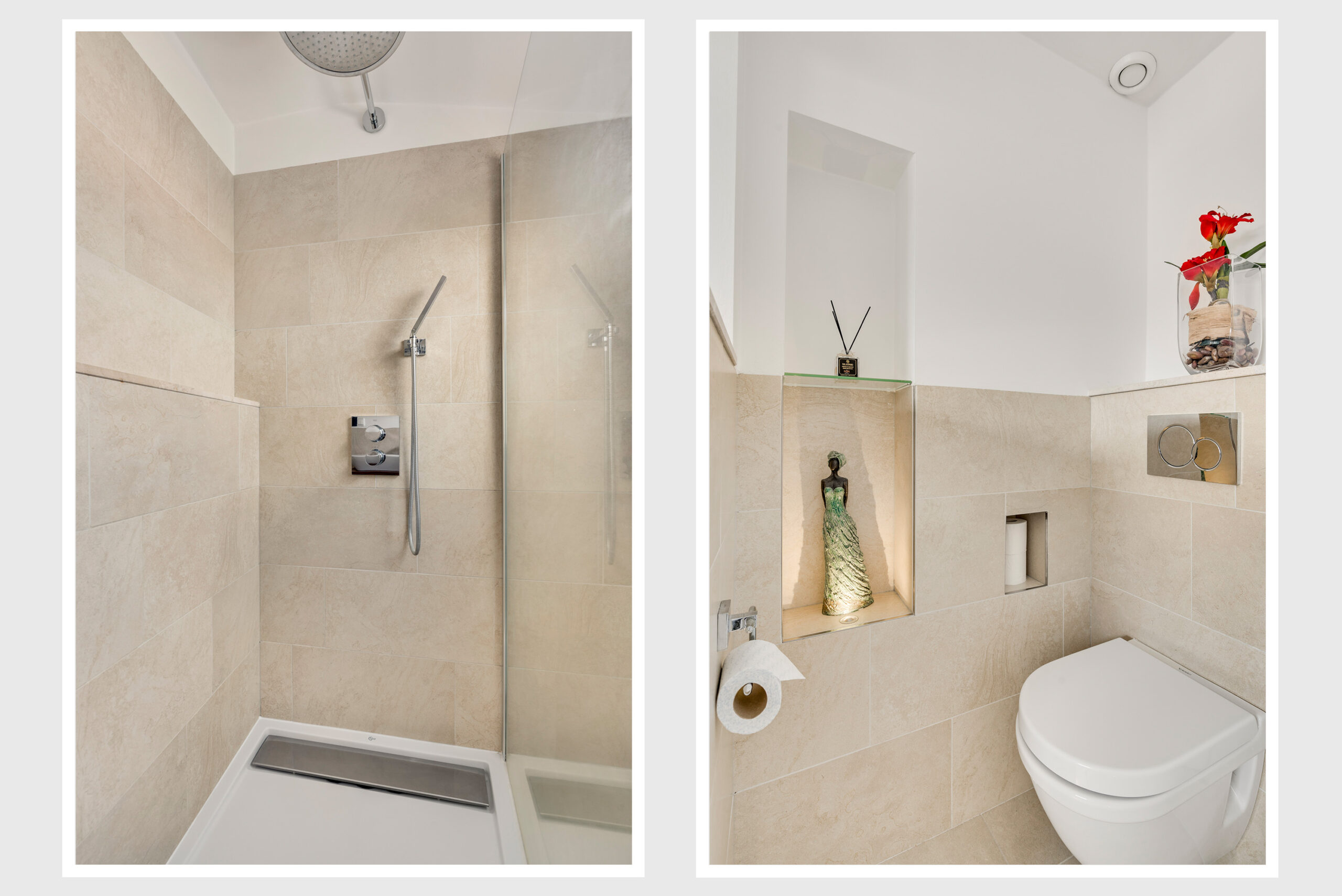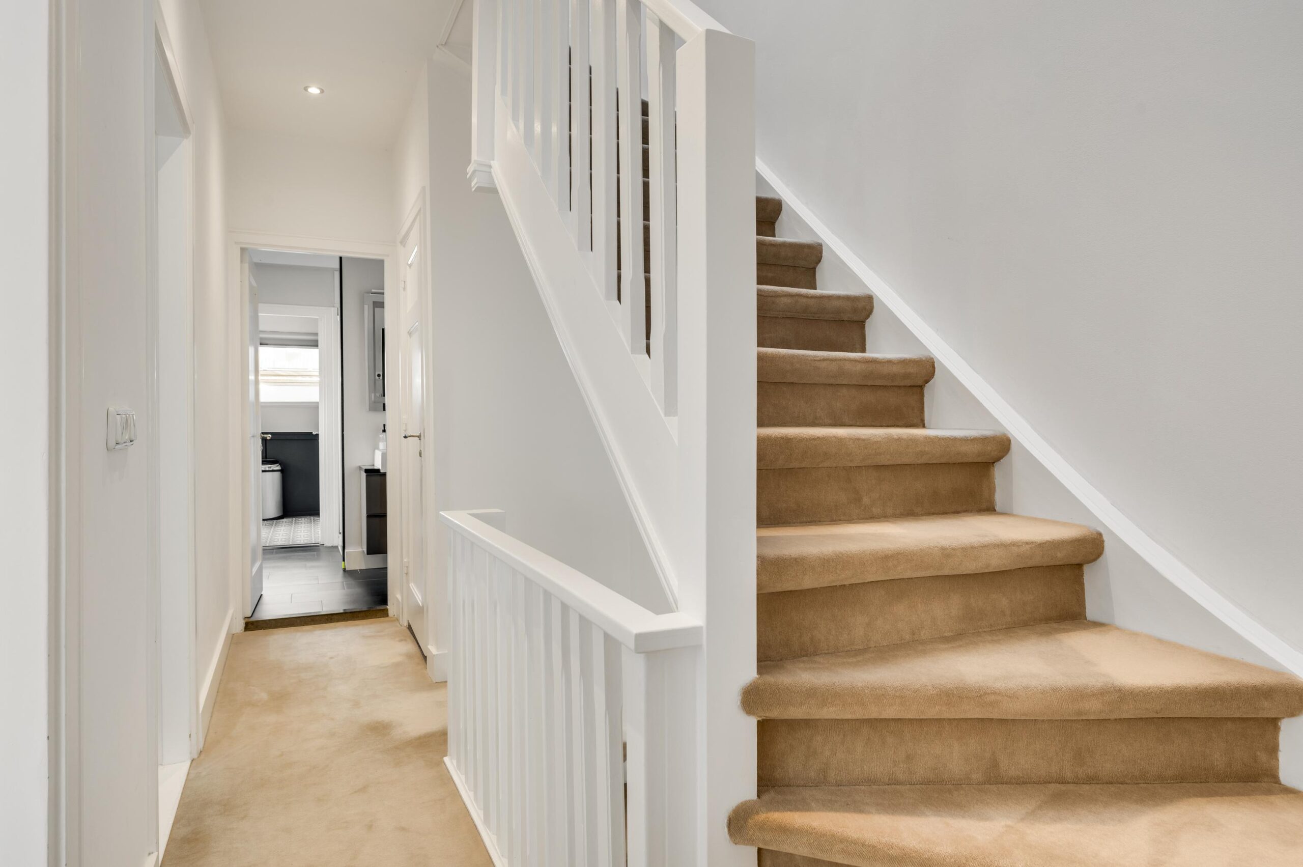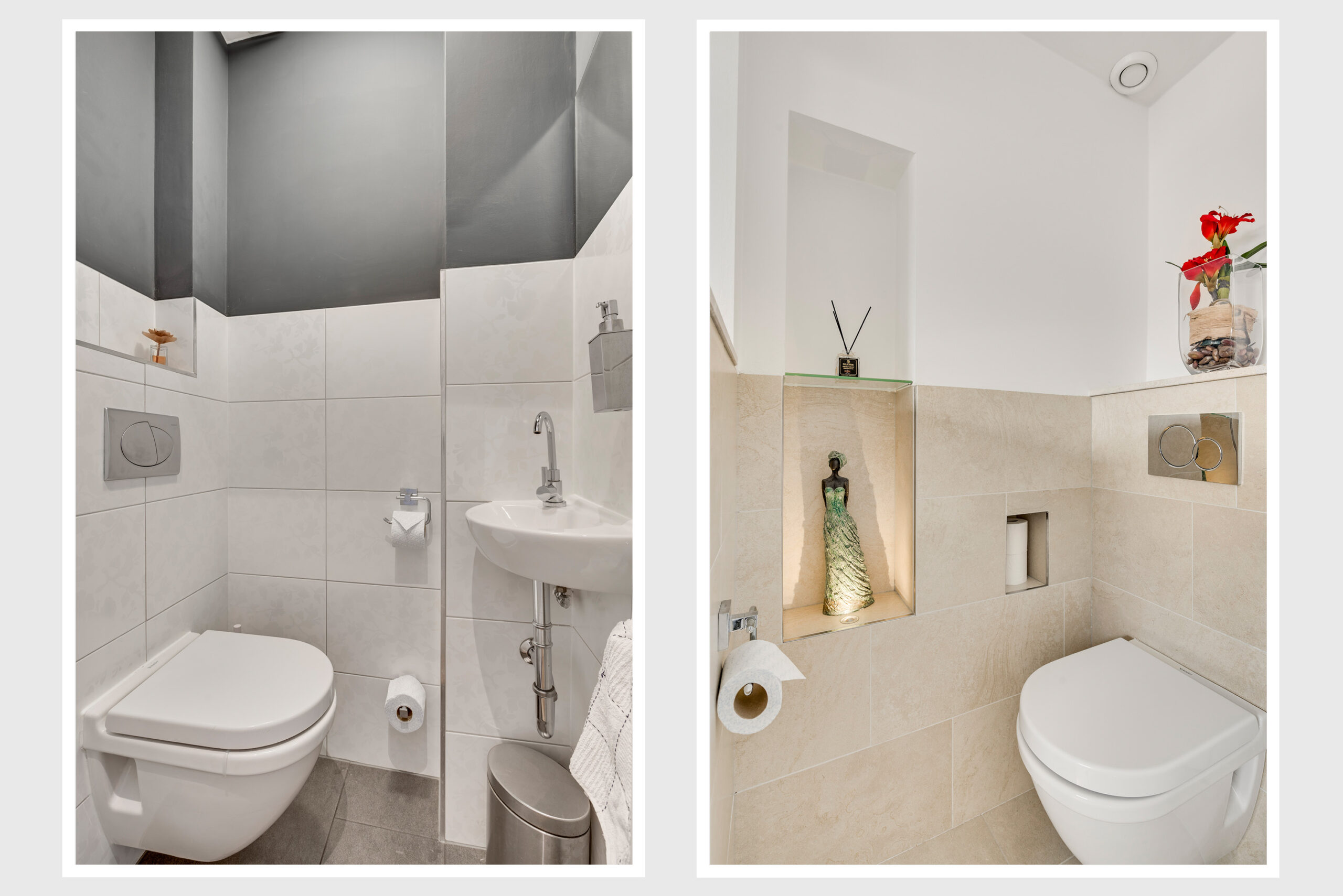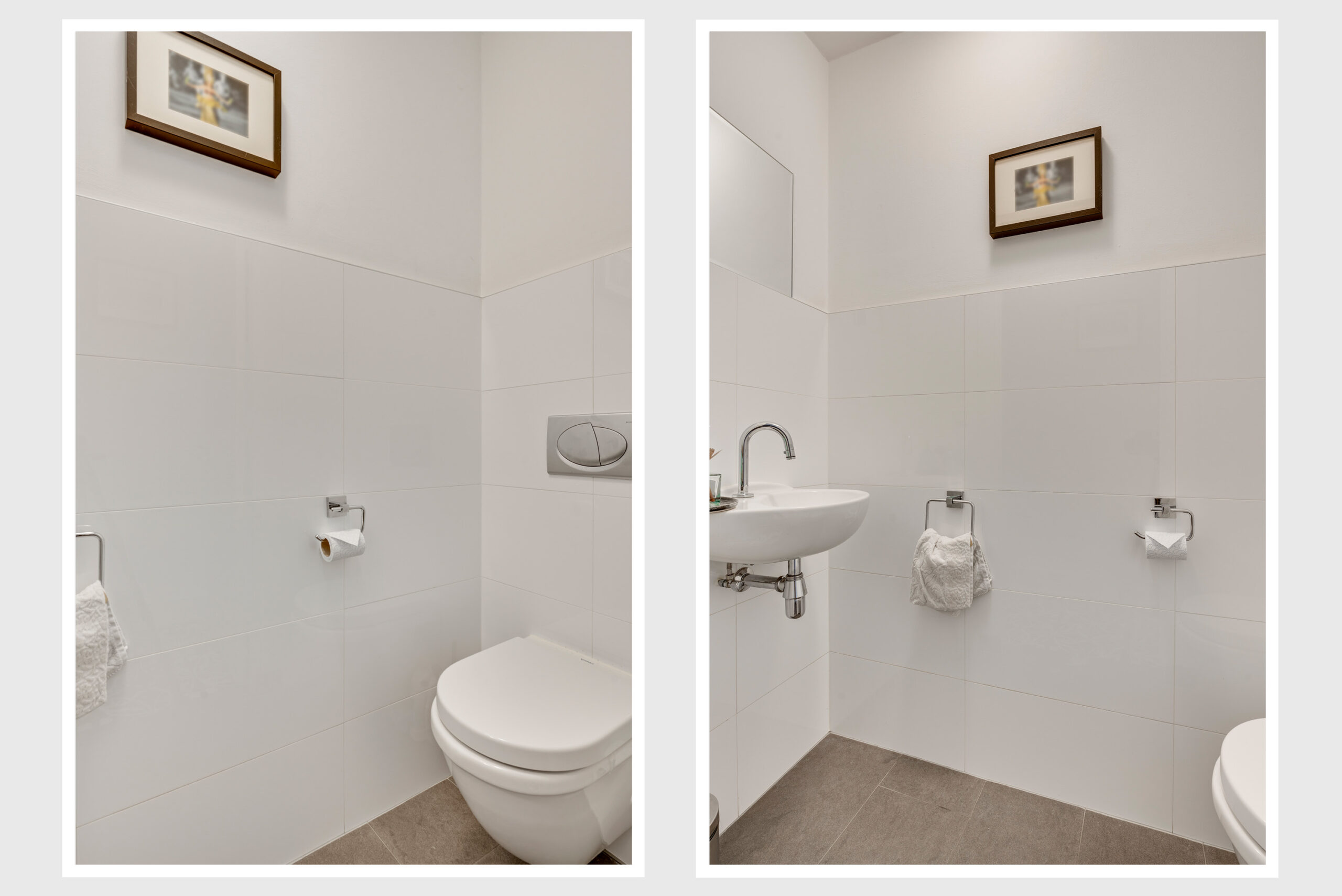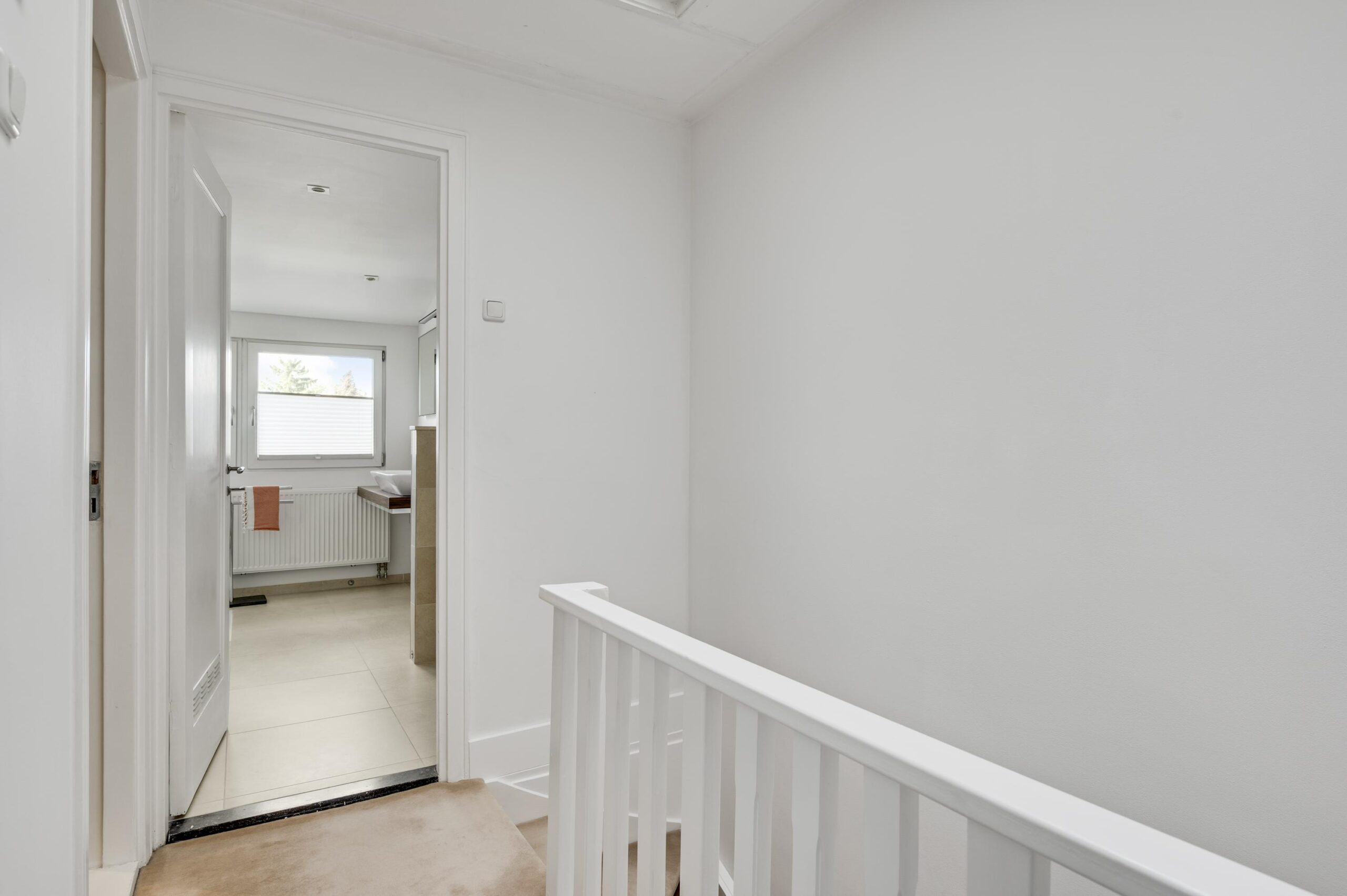 De overloop geeft toegang tot een separate toiletruimte met wandcloset en fontein.