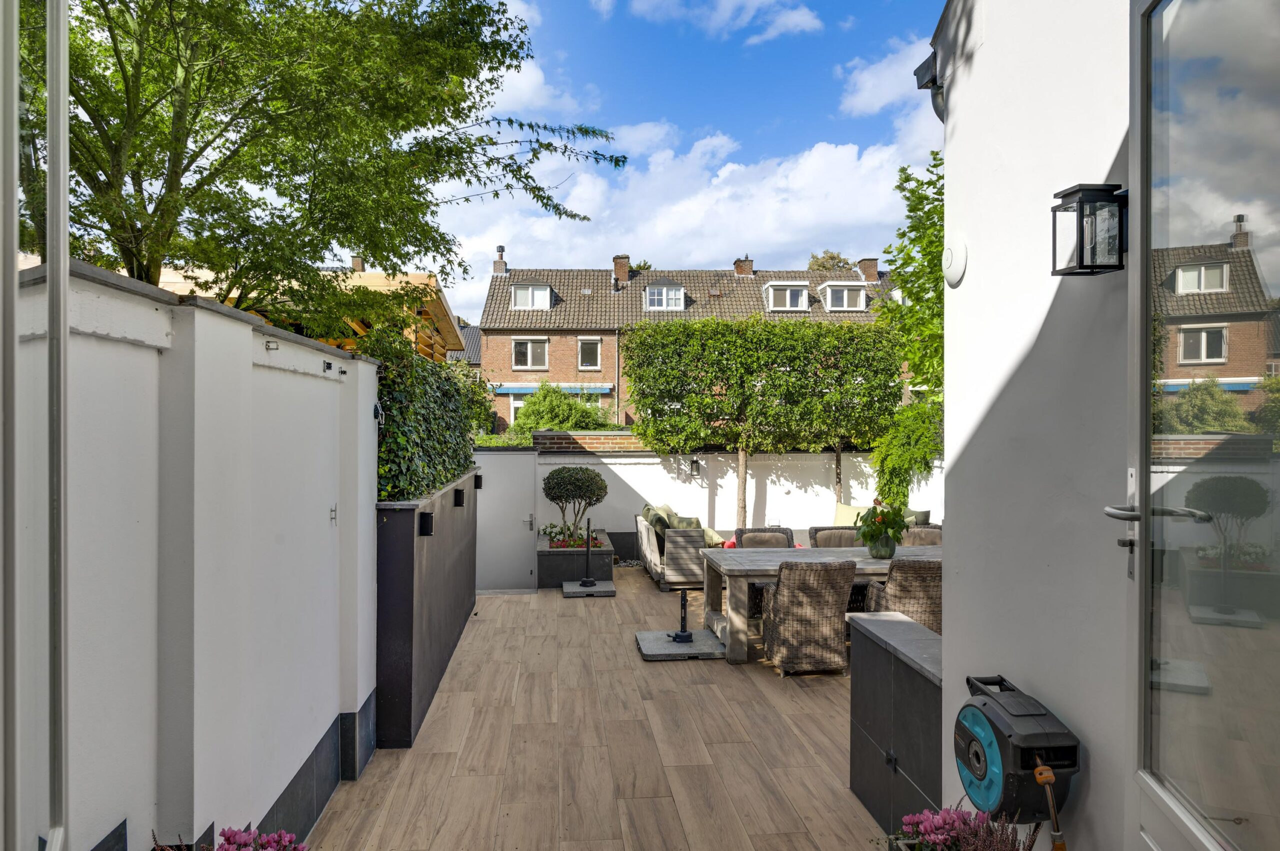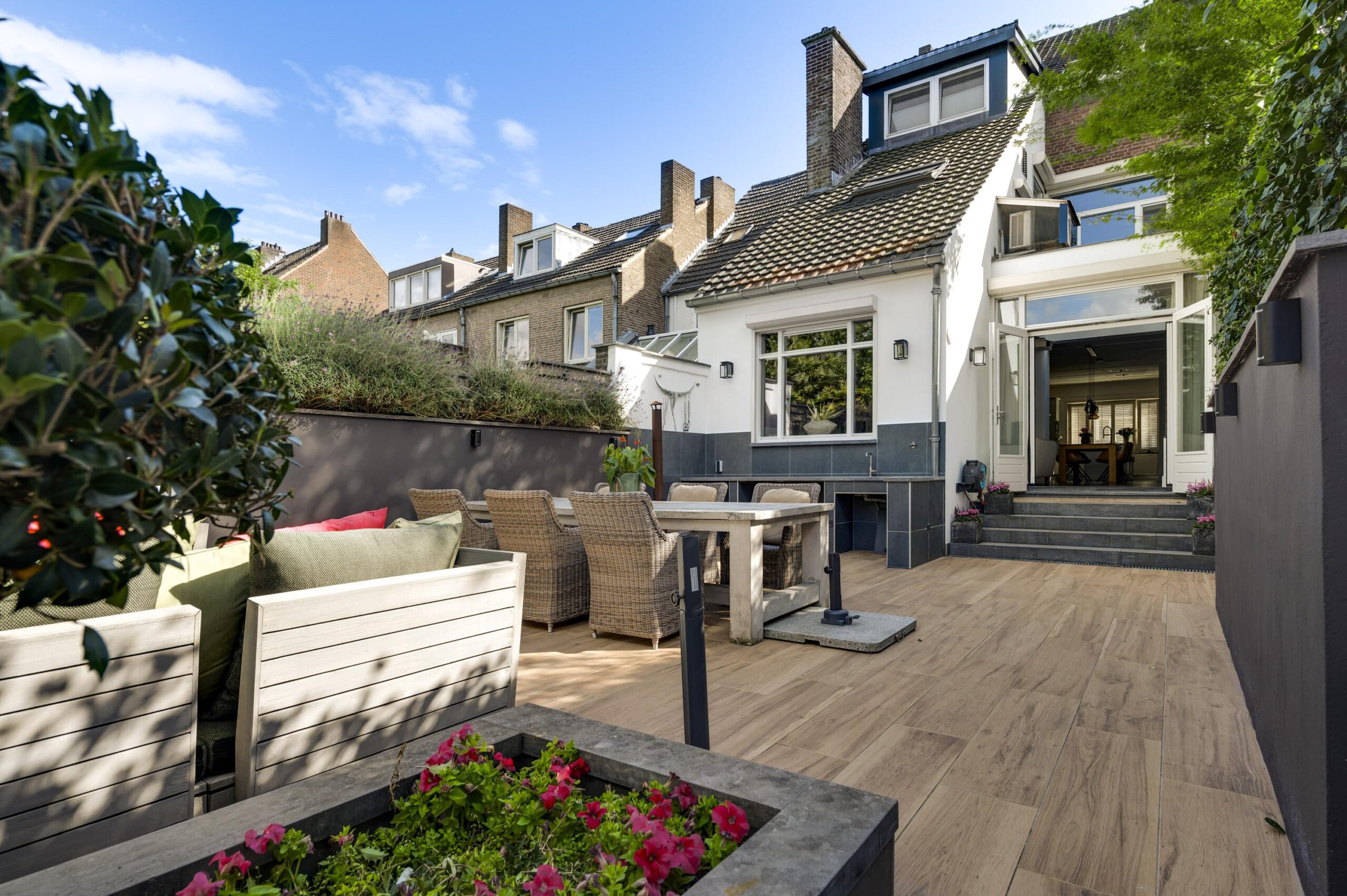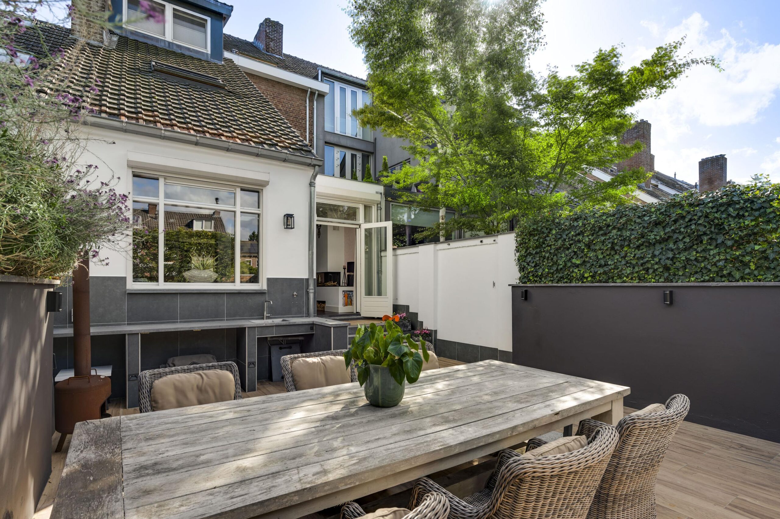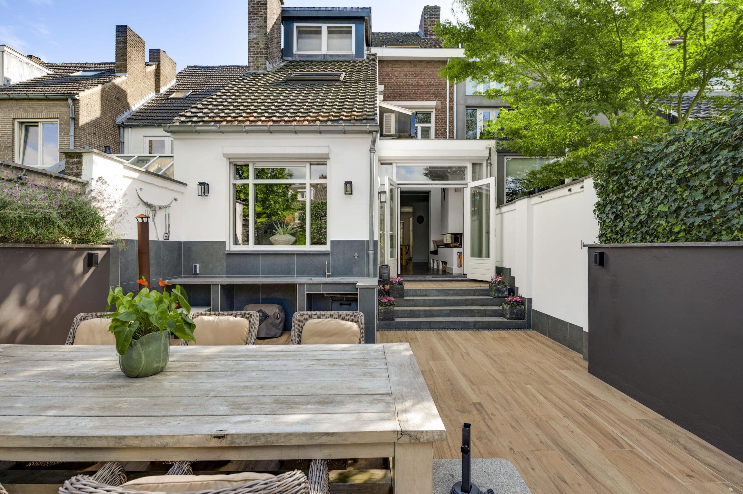 Aan de achterzijde bevindt zich de verzorgde, ommuurde stadstuin van circa 113 m². Deze buitenruimte is ingericht met meerdere terrassen, een buitenkeuken en een achterom die leidt naar de privé garage.
