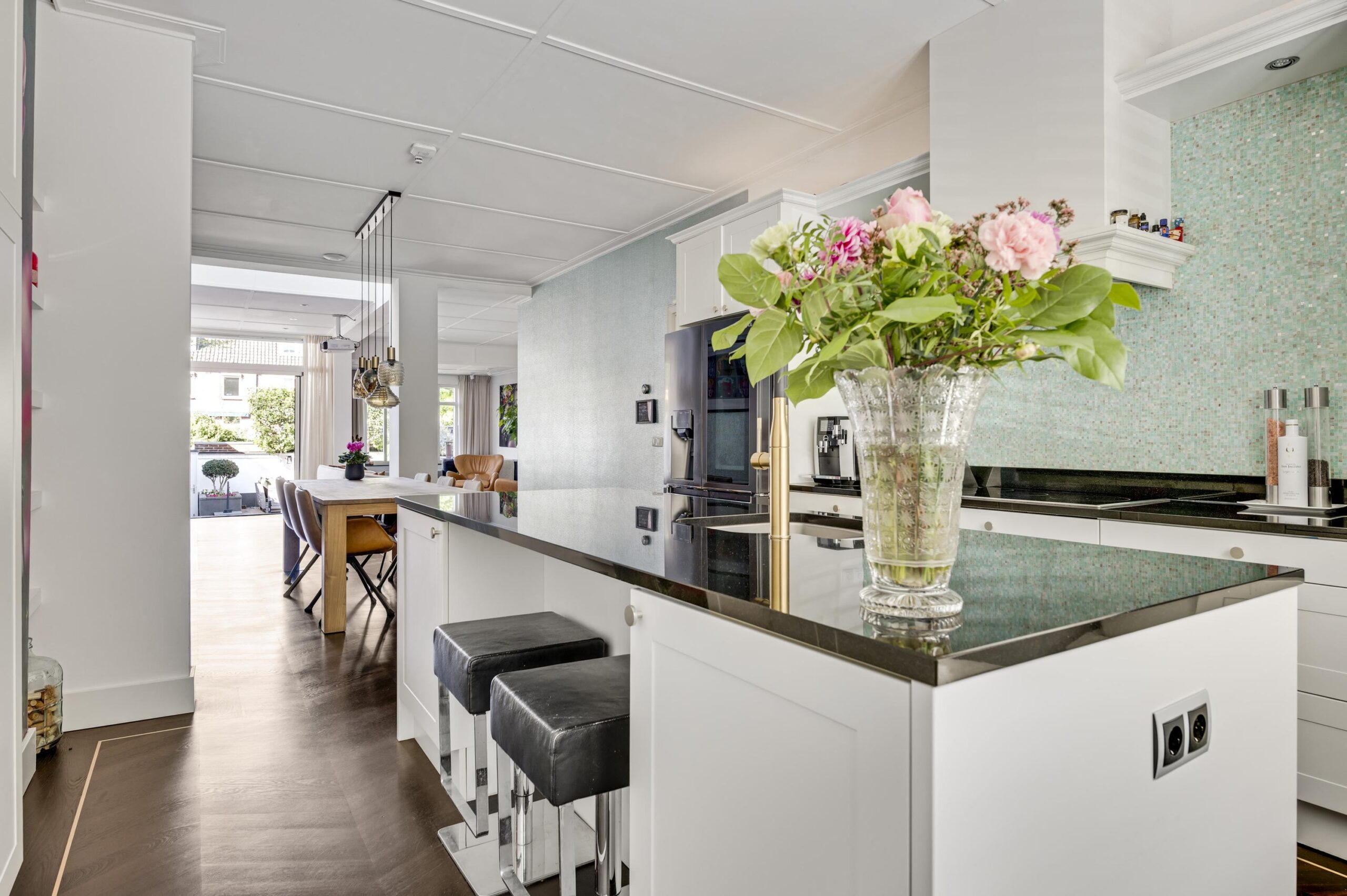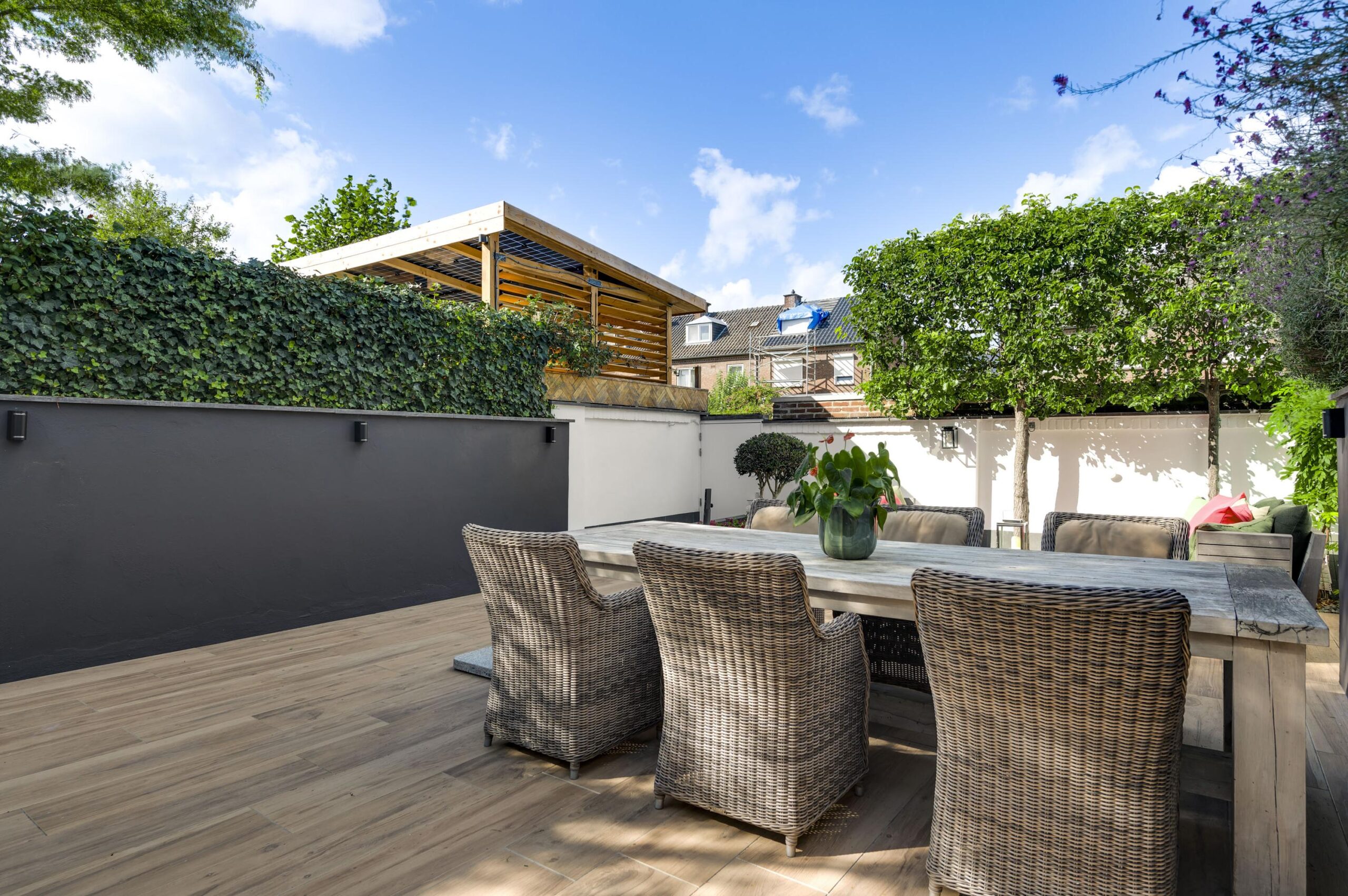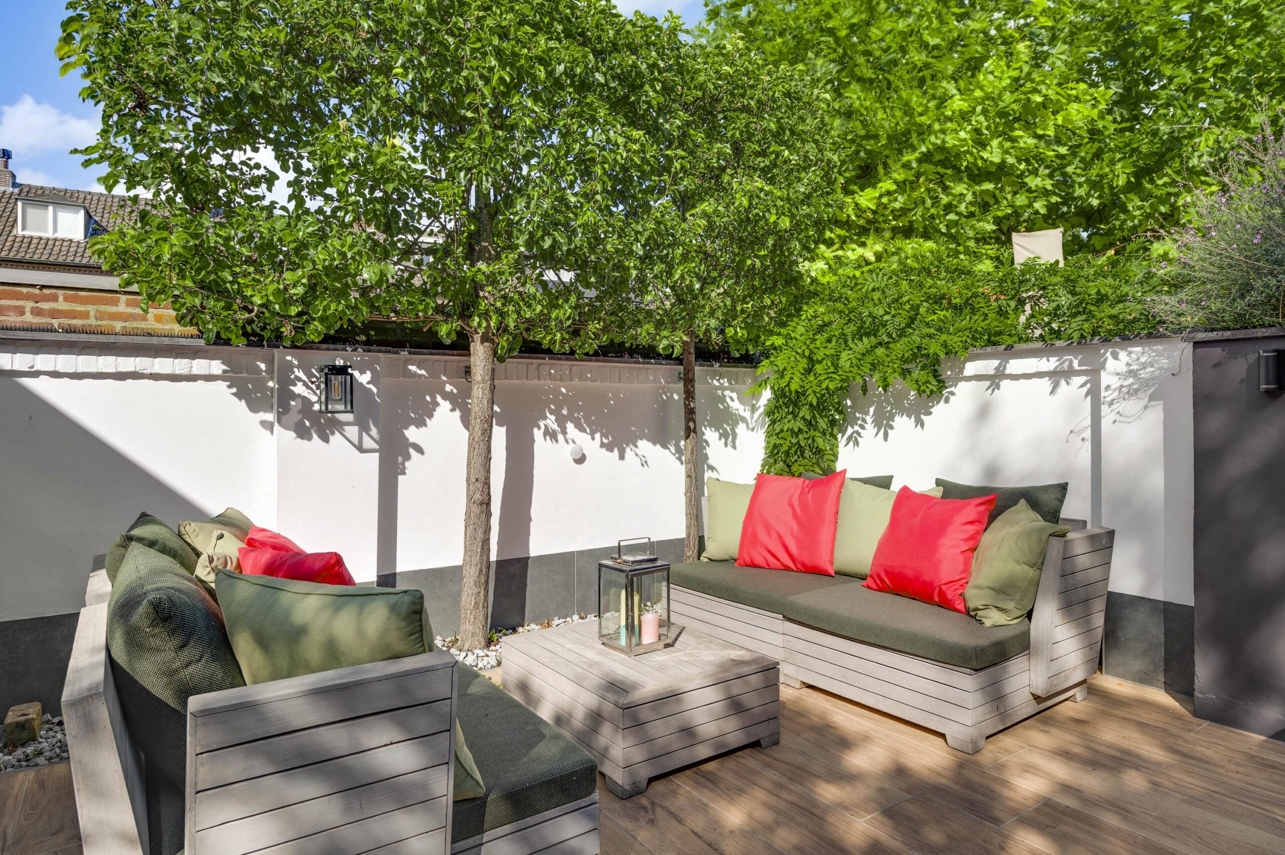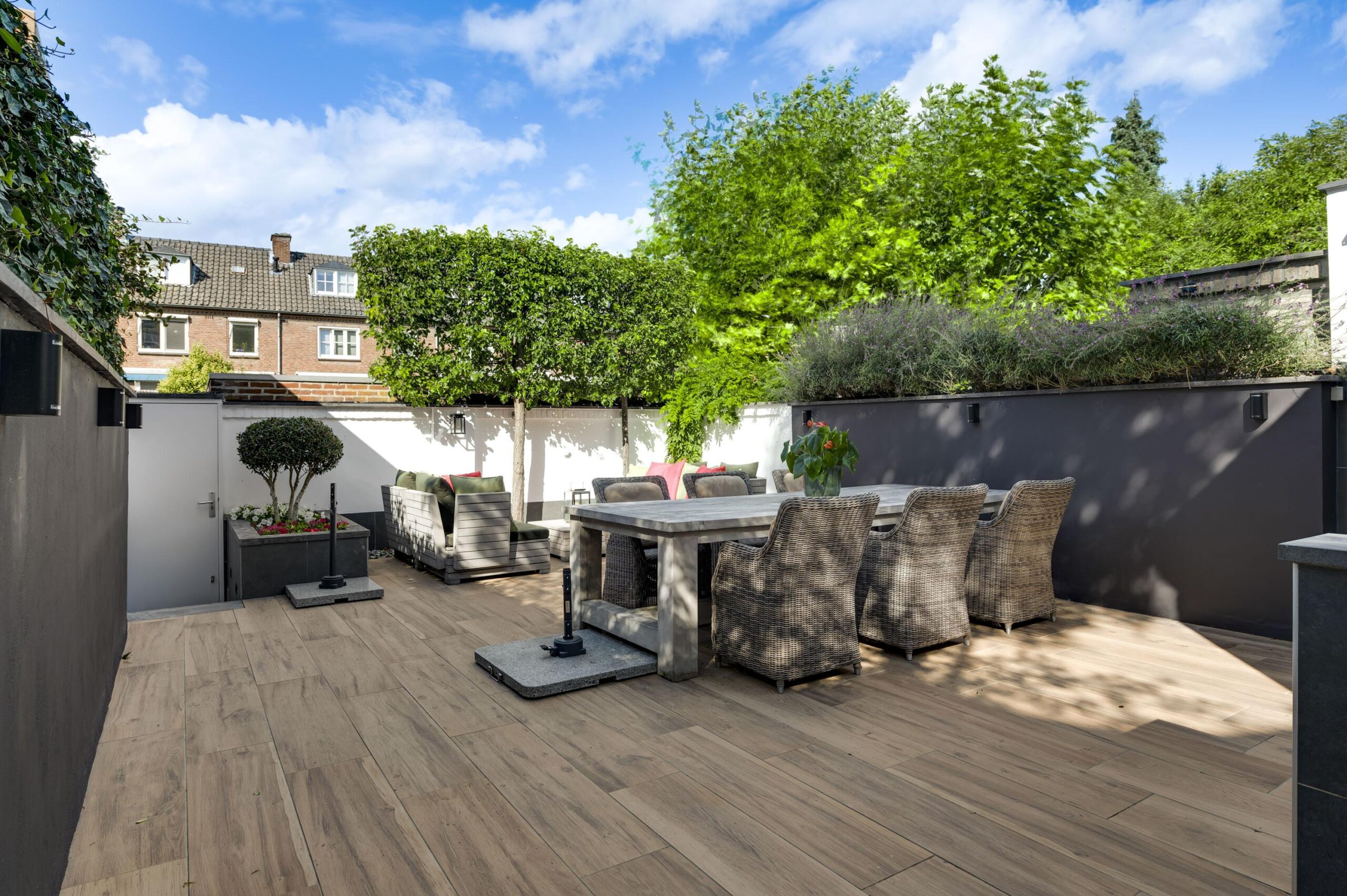 Aan de achterzijde bevindt zich de verzorgde, ommuurde stadstuin van circa 113 m². Deze buitenruimte is ingericht met meerdere terrassen, een buitenkeuken en een achterom die leidt naar de privé garage.