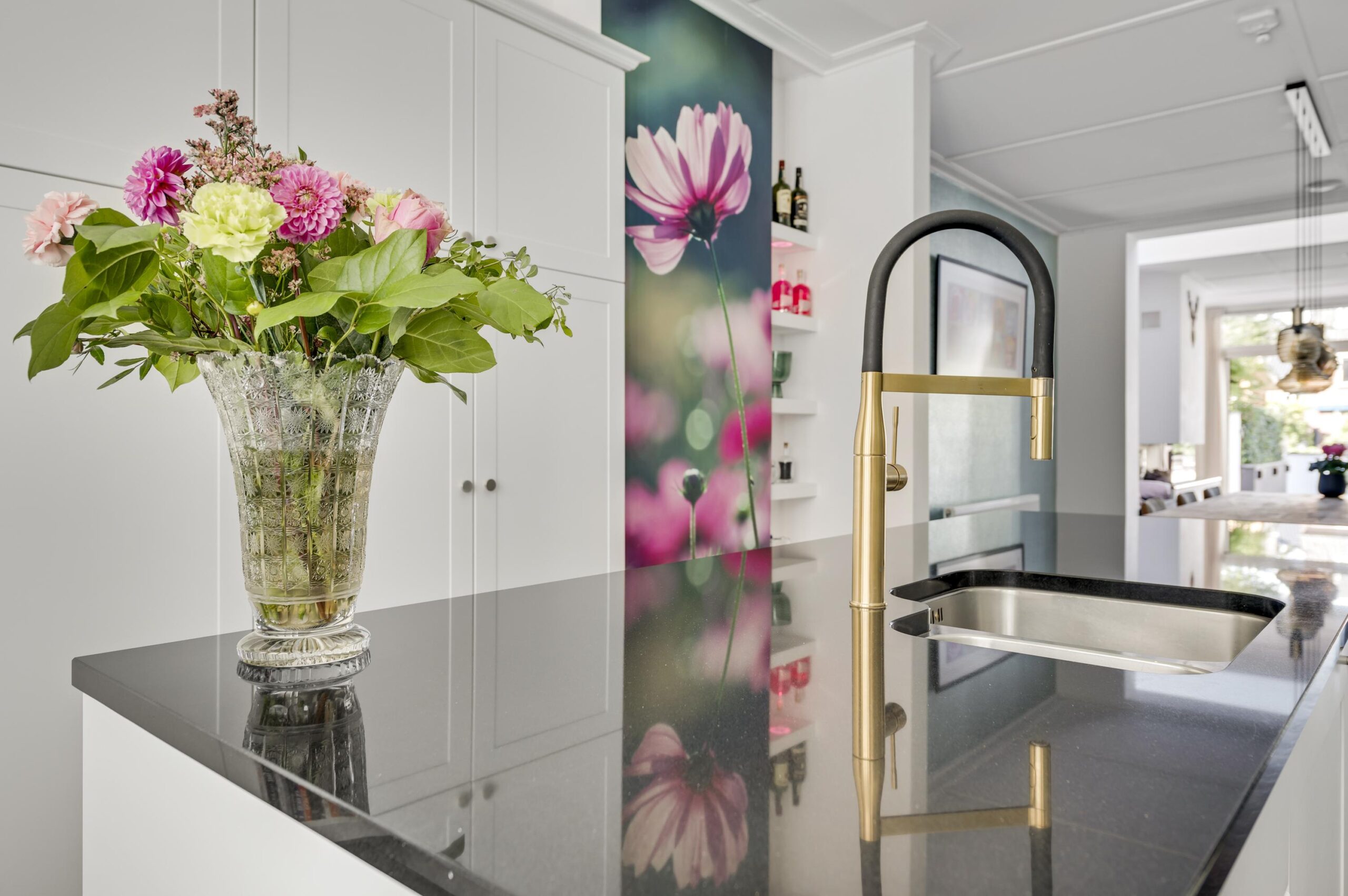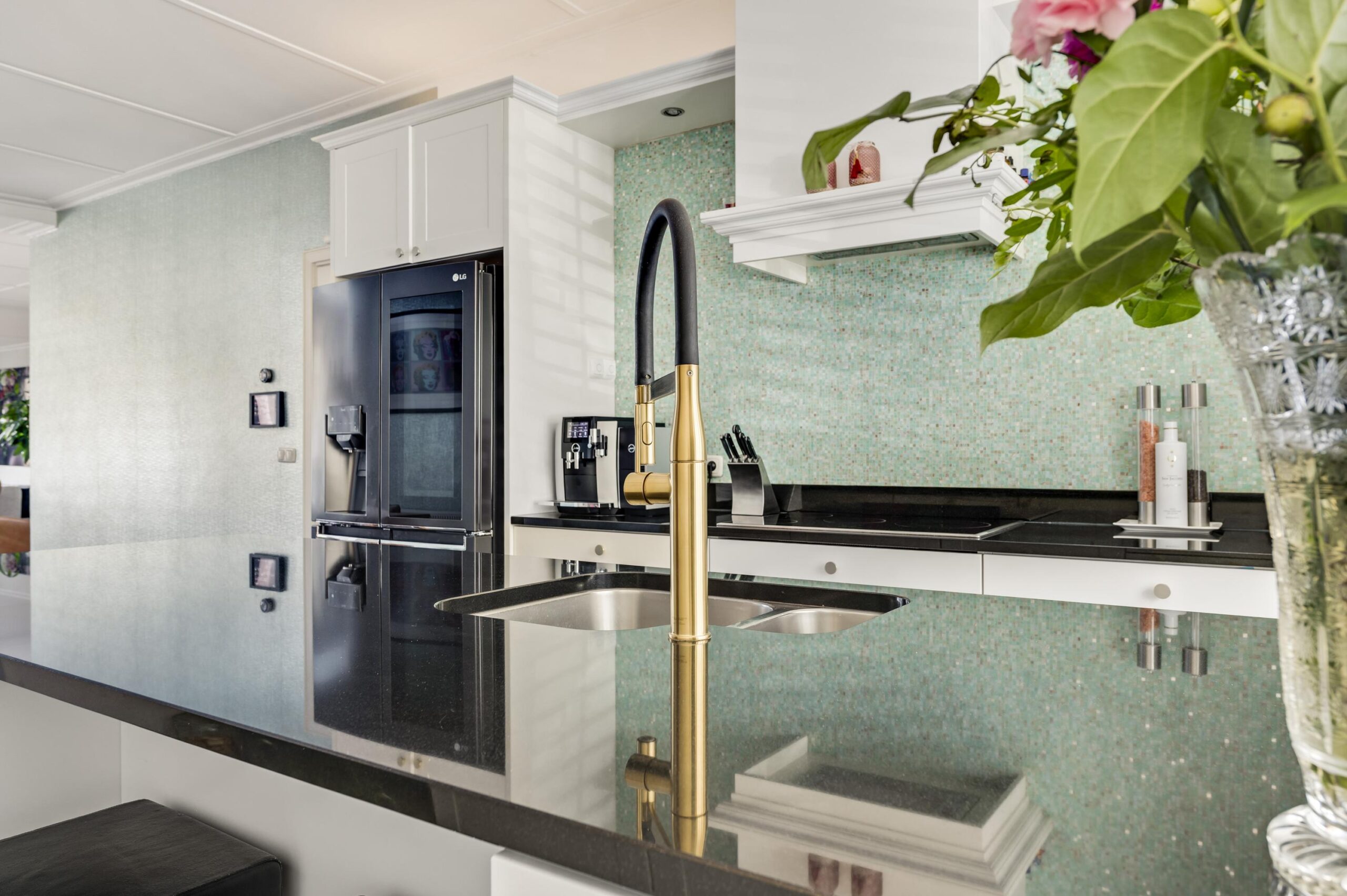 De luxe open keuken is volledig uitgerust met een kookeiland, inductiekookplaat, afzuigkap, vaatwasser, spoelbak, magnetron, oven, koel-vriescombinatie en een stijlvol composiet werkblad.