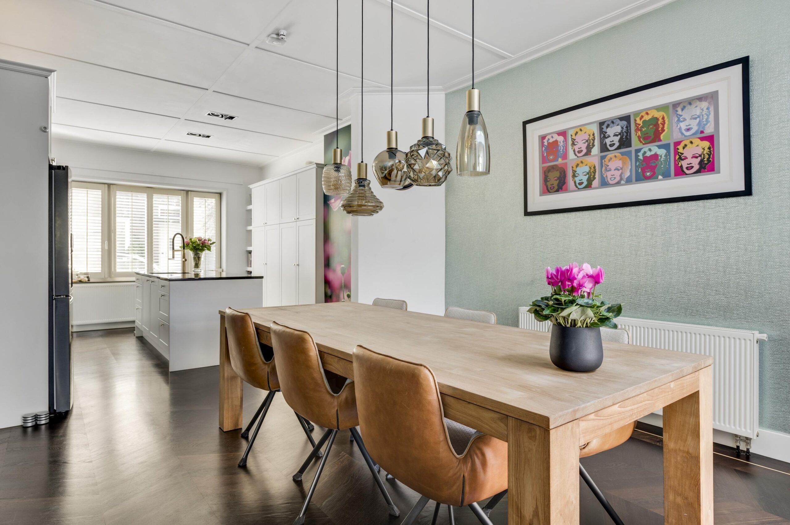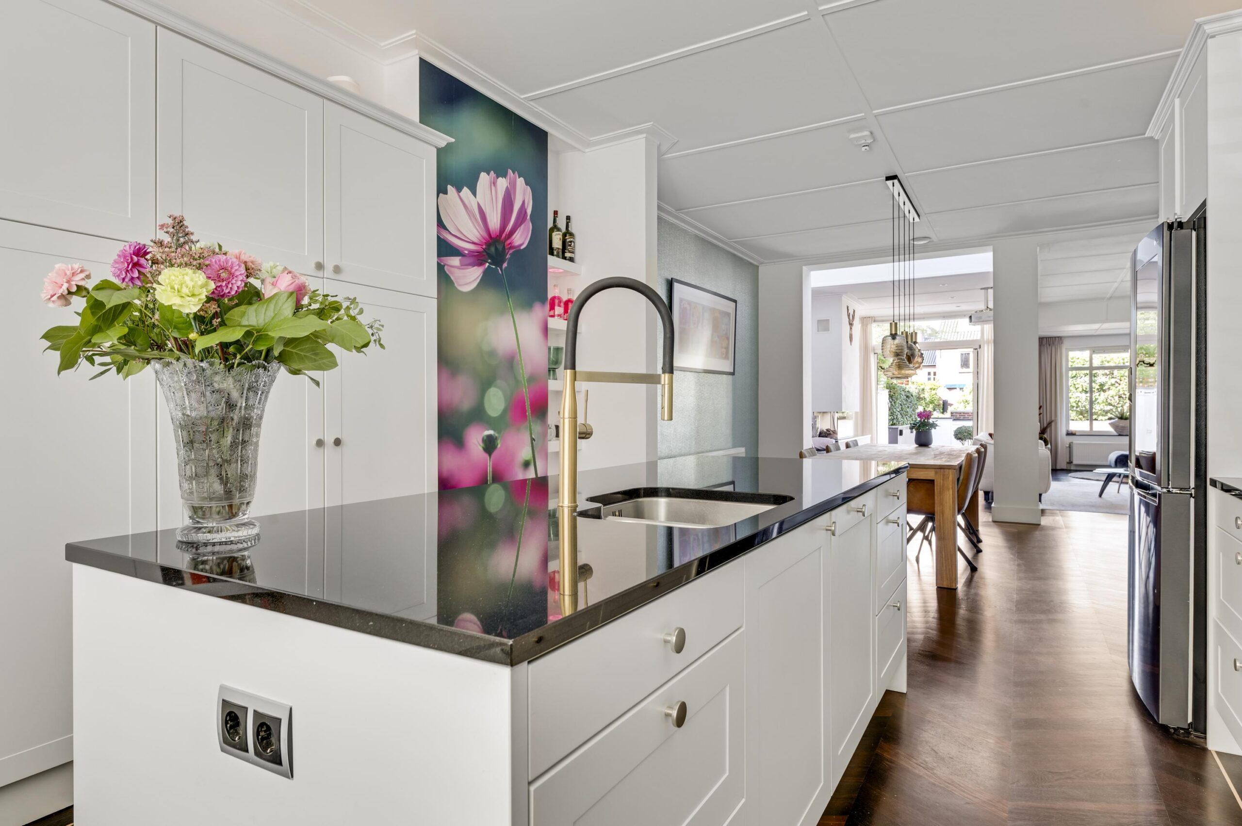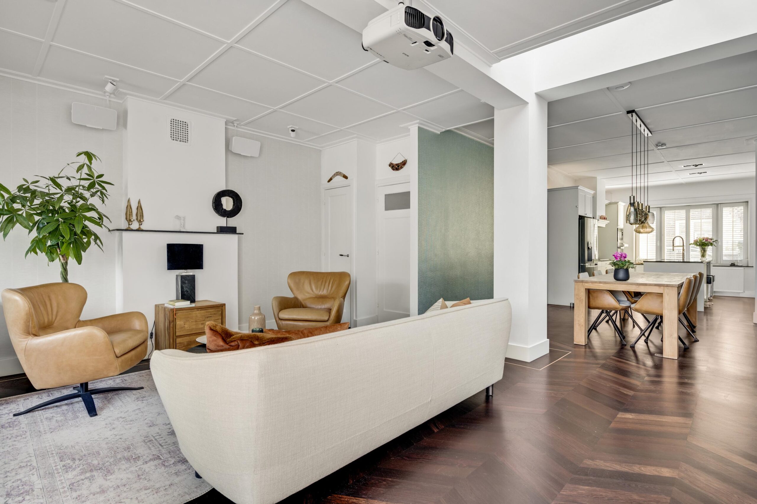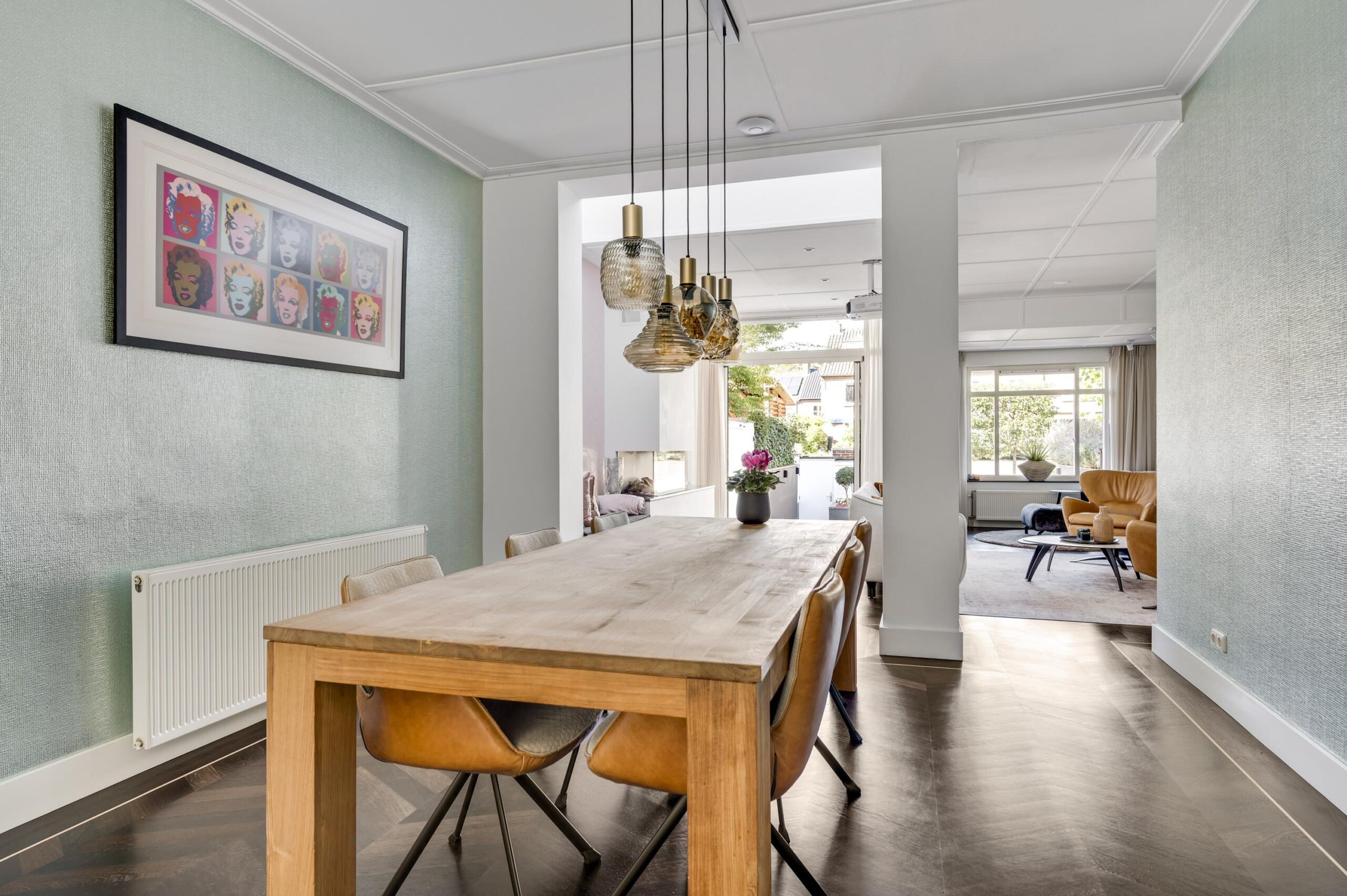 De open living van circa 65 m² is een prachtige, lichte ruimte met een hoogwaardige parketvloer in ‘Hongaarse punt’, openslaande deuren naar de tuin en twee zitgedeeltes, waarvan één met een sfeervolle gashaard.