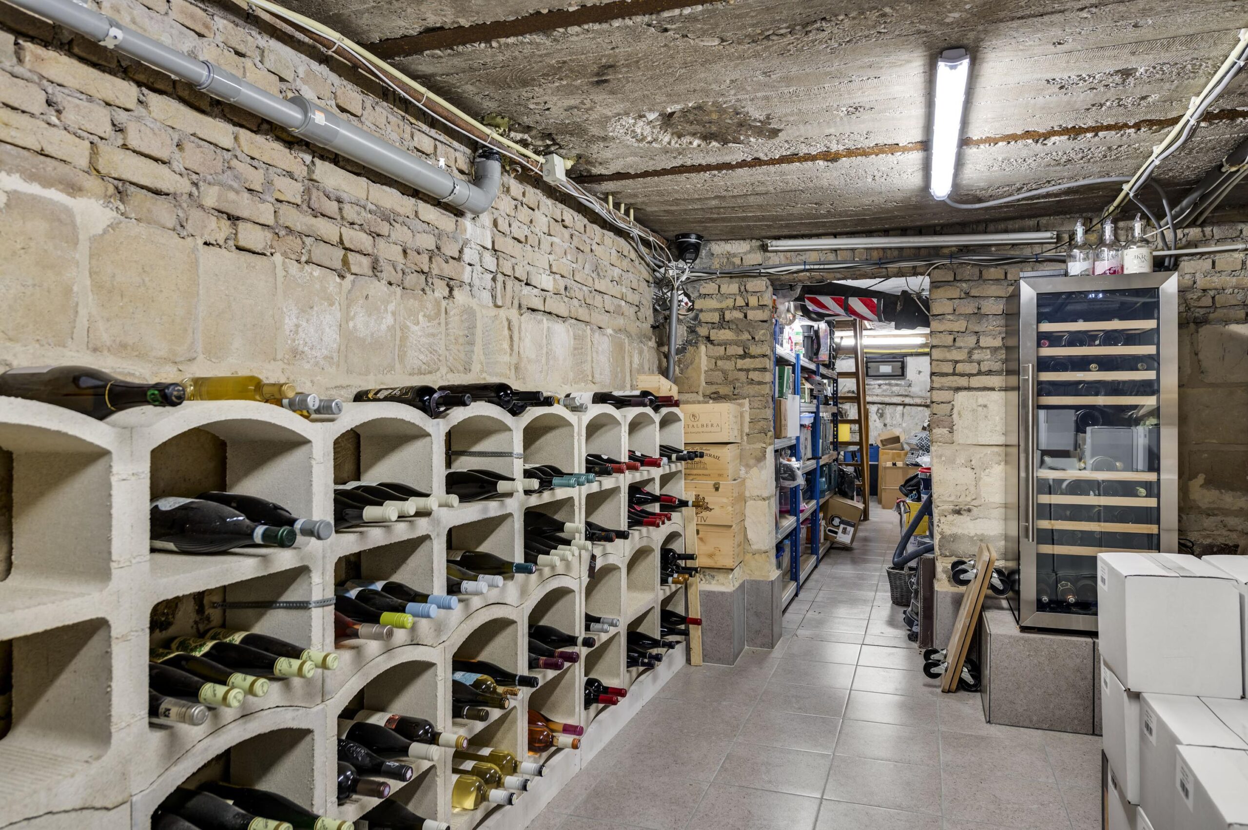 Het souterrain bestaat uit twee ruime kelderruimten met afmetingen van respectievelijk 835 x 383 cm en 677 x 288 cm, ideaal voor opslag, hobbyruimte of wijnkelder.