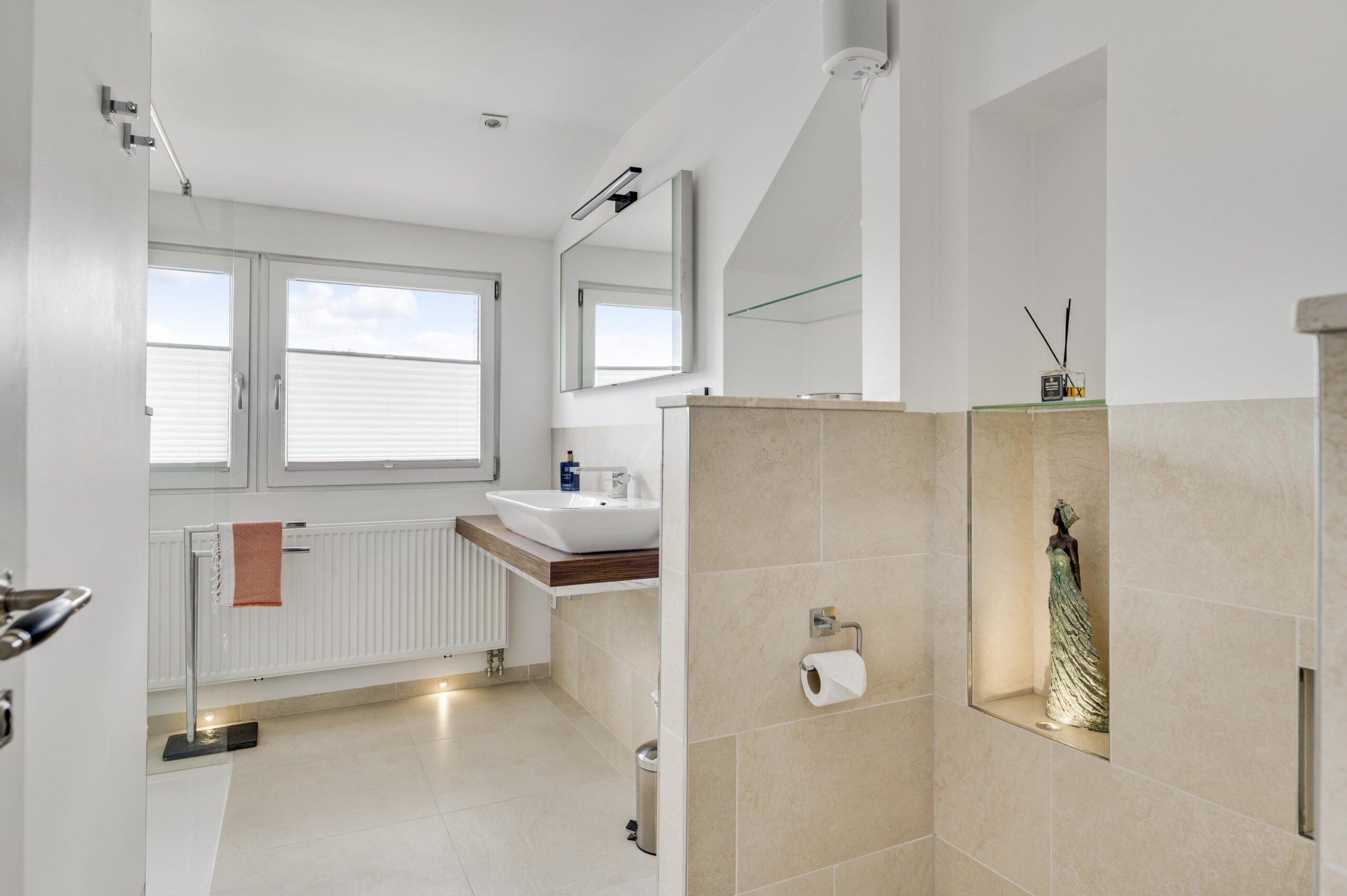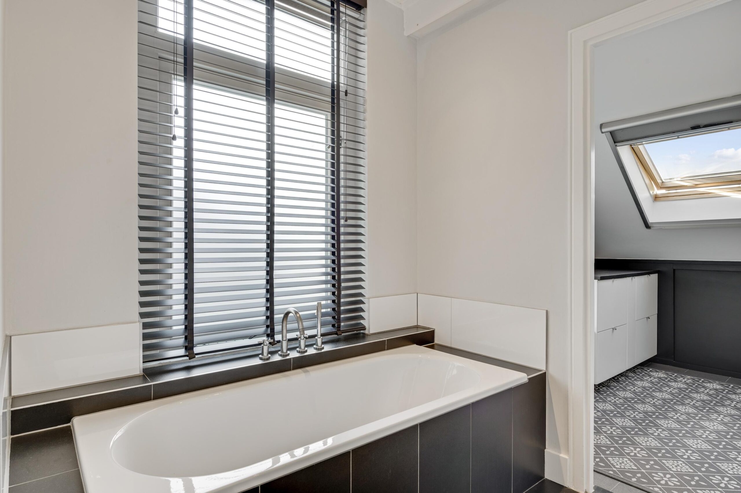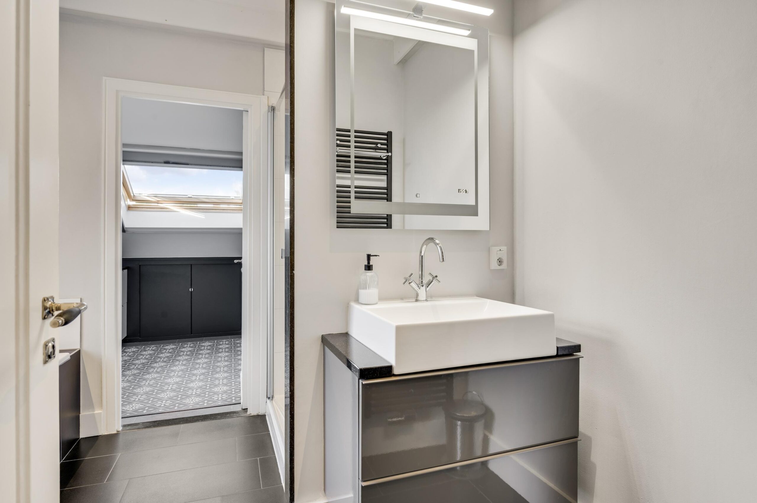 De tweede badkamer, met een speelse indeling van circa 363/141 x 145 cm, is uitgerust met een wandcloset, een vaste wastafel en een inloopdouche.