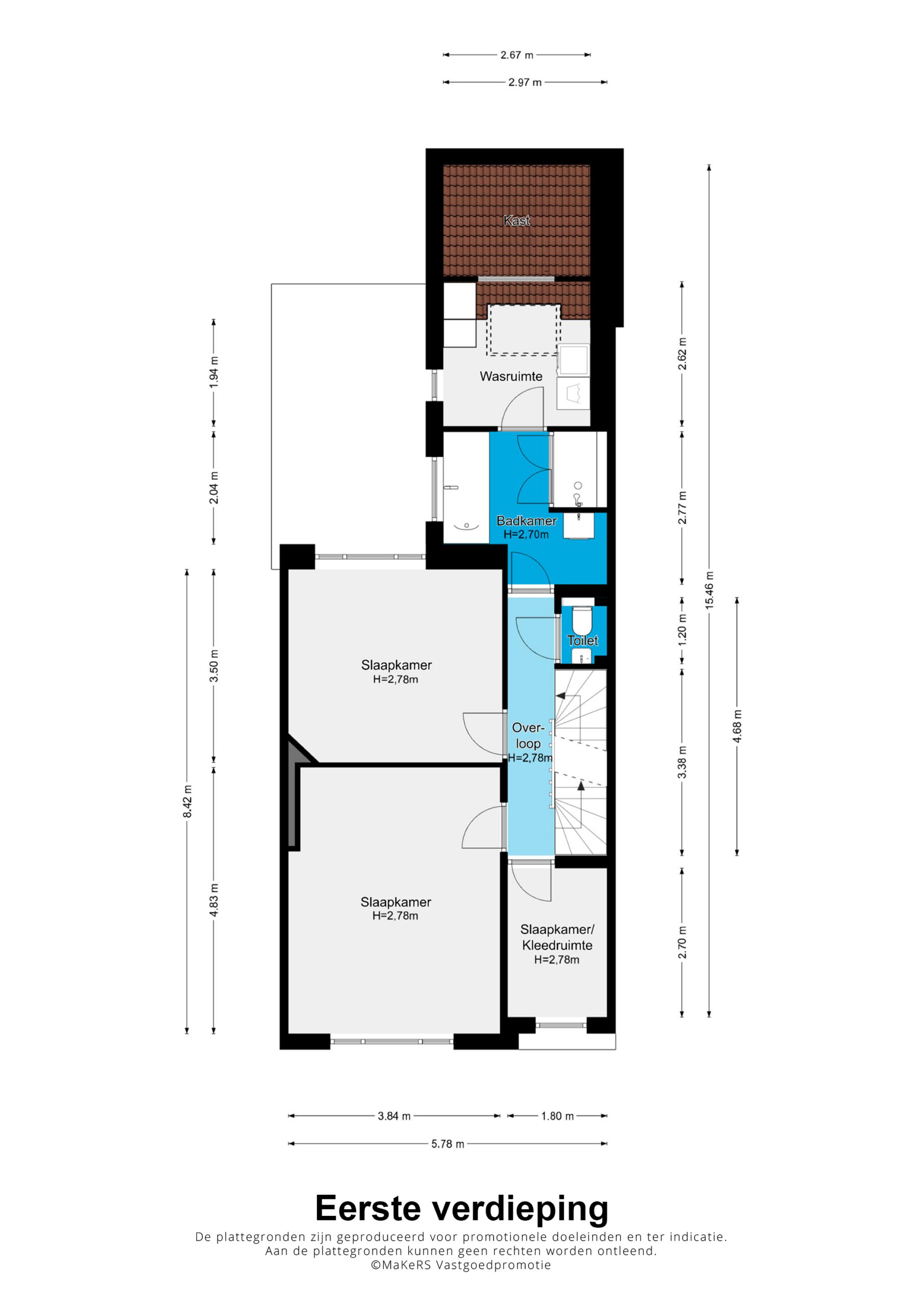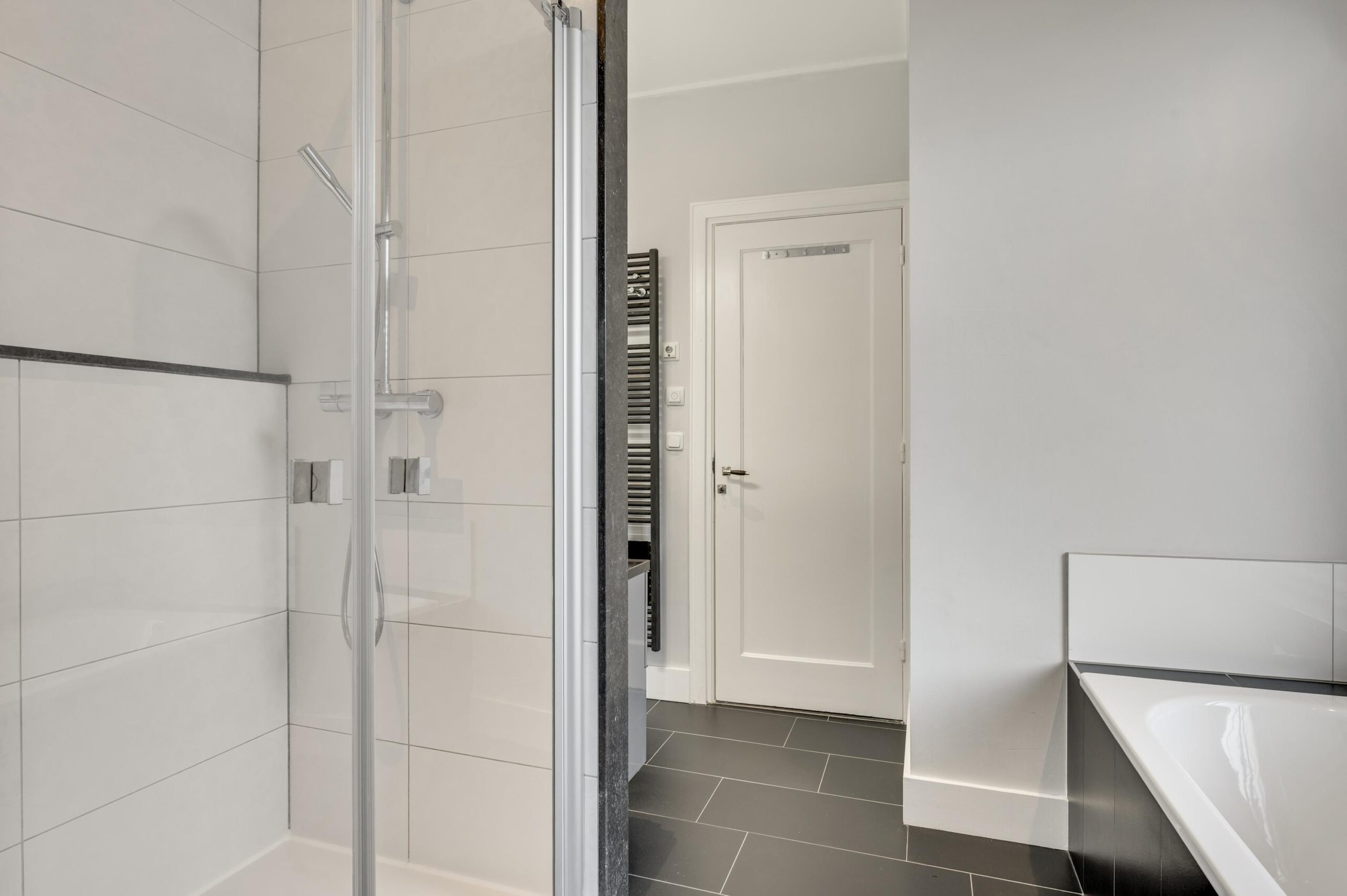 De luxe eerste badkamer van circa 277 x 180 cm beschikt over een vaste wastafel met meubelombouw, een ruime inloopdouche, een ligbad en directe toegang tot de wasruimte. Deze aangrenzende ruimte van 297 x 262 cm biedt plaats aan wasmachine en droger en beschikt over praktische kastruimte.
