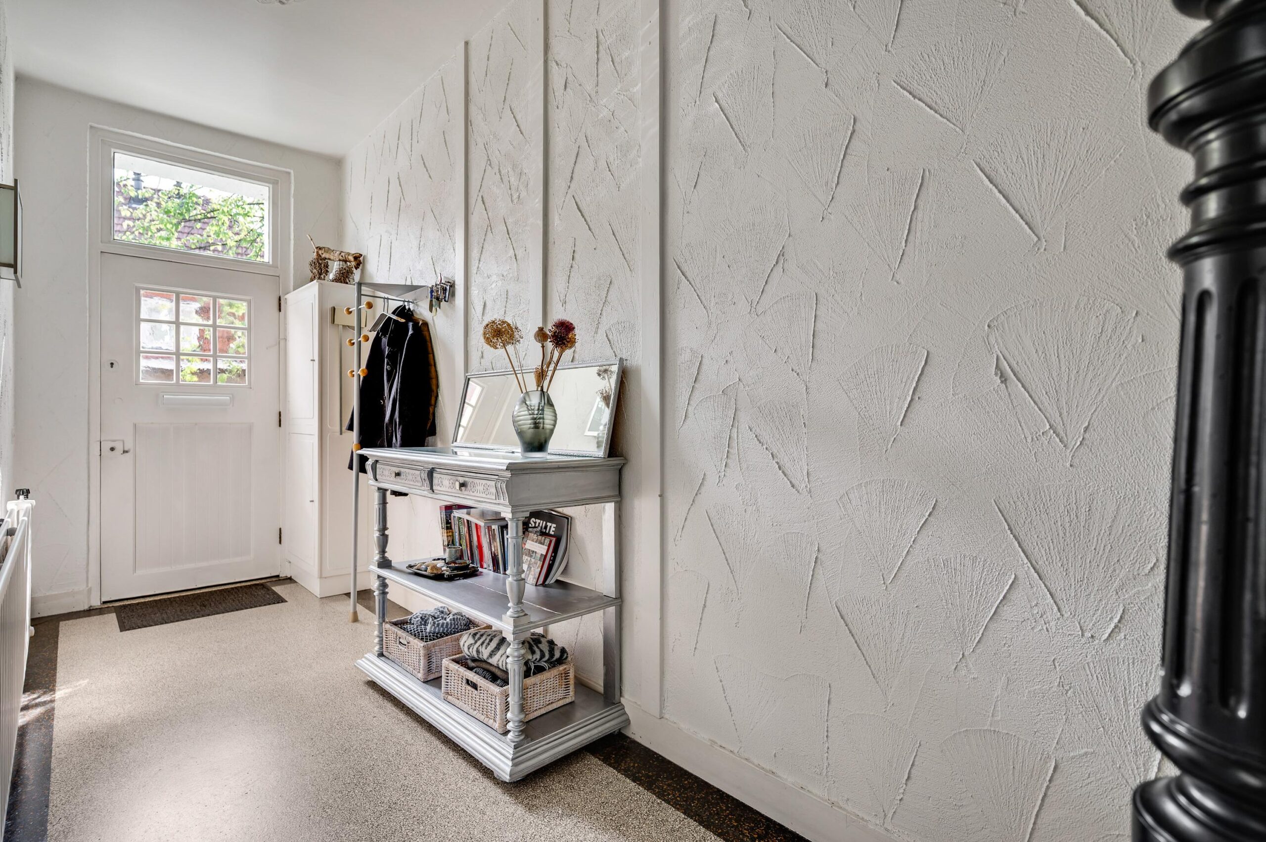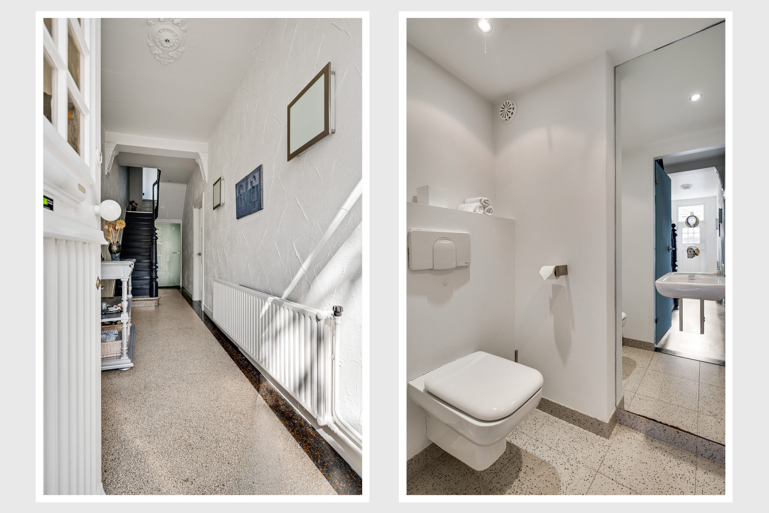 Hal met een terrazzovloer, een mooi trappenhuis en toegang tot de kelder en de meterkast.