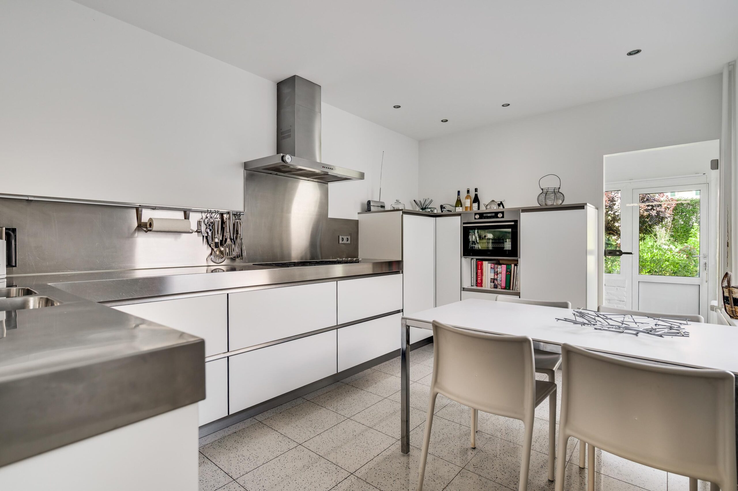 De deels open keuken heeft een afmeting van 440 bij 300 cm, een tegelvloer en een moderne inrichting met rvs werkblad, gaskookplaat, afzuigkap, combi-oven, vaatwasser, diepvries en koelkast, met doorgang naar de bijkeuken. Deze bijkeuken meet 324 bij 189 cm, bevat de opstelling voor de cv-ketel (huur), aansluitingen voor wasmachine en droger, en biedt toegang tot de tuin.