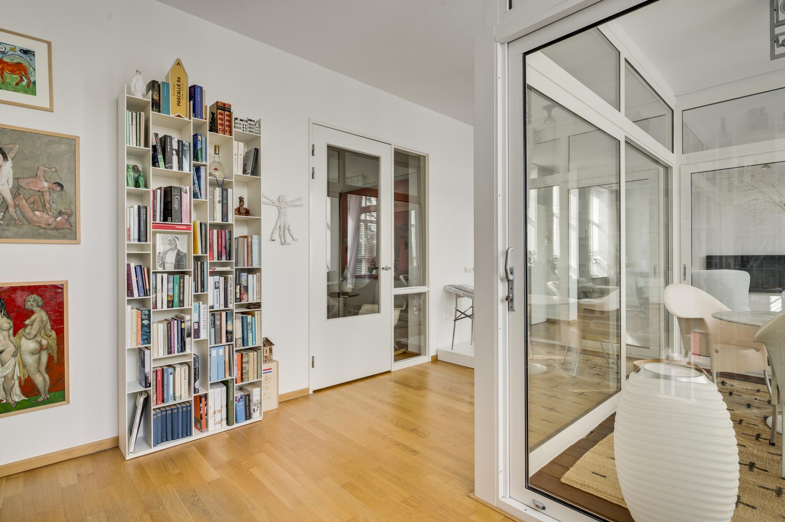Living van circa 70 m² met grote raampartijen, een overvloed aan natuurlijk licht en hoge plafonds en serre toegankelijk via schuifpui.